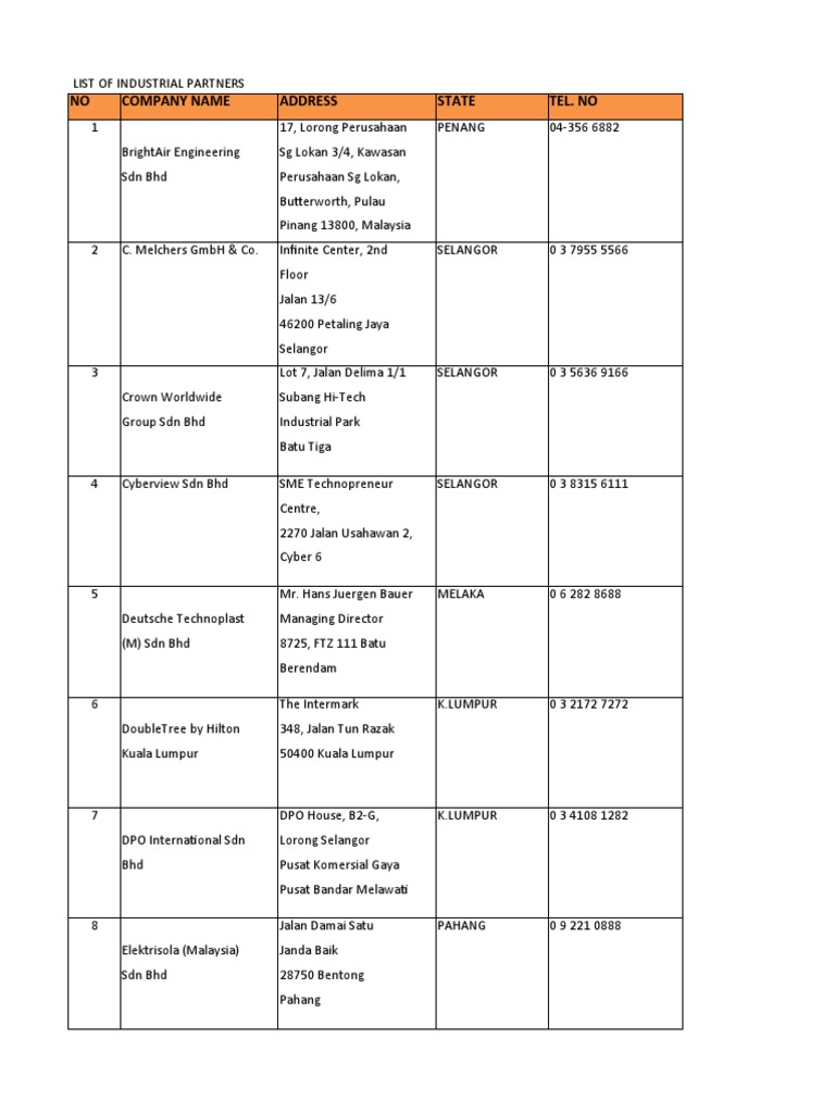 List Of Industrial Partners Pdf Malaysia Business